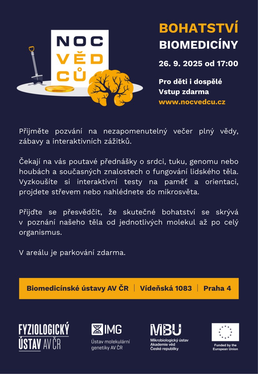 Akce se koná v areálu biomedicínských ústavů na Praze 4 (zastávka Ústavy akademie věd), můžete se těšit se na přednášky, workshopy, prohlídky budovami, praktické ukázky a zábavu pro děti i dospělé.