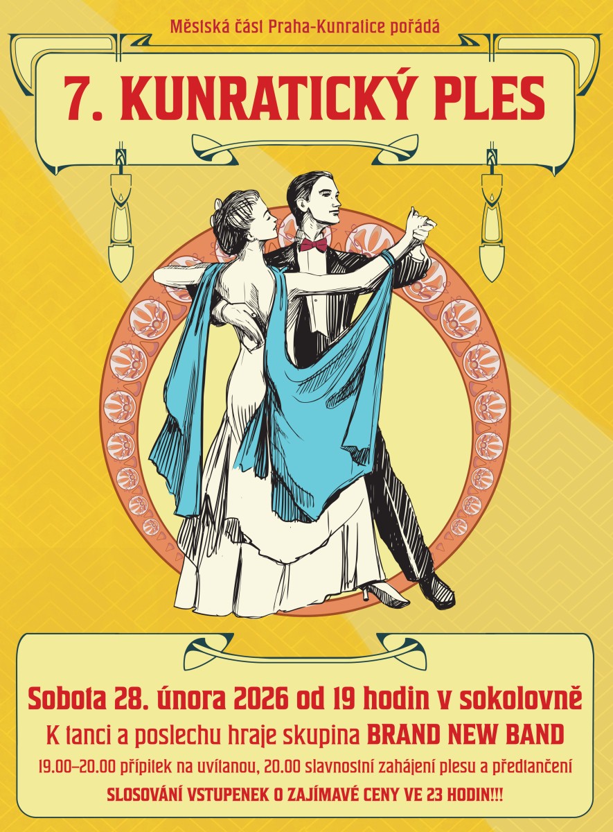 Srdečně Vás zveme na již tradiční Kunratický ples, dne 28.2.2026, organizovaný MČ Praha-Kunratice v budově místní Sokolovny.
