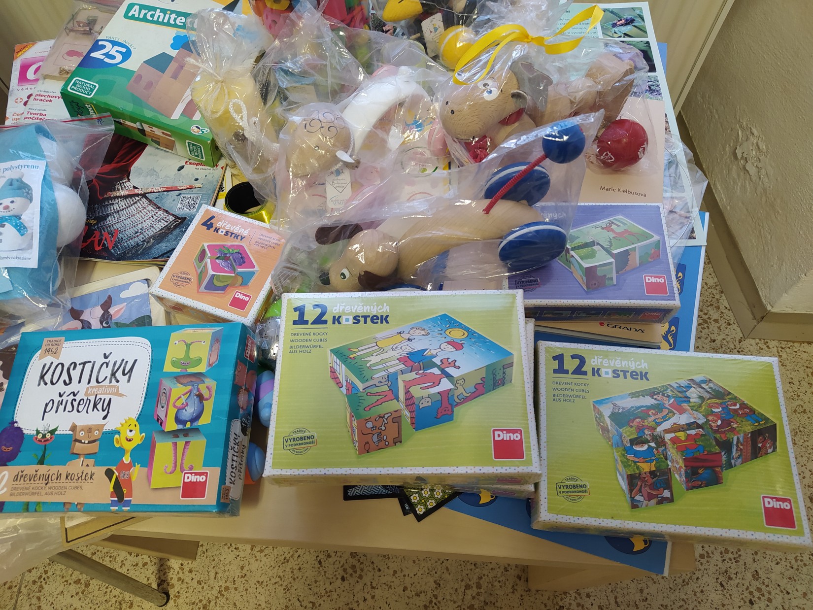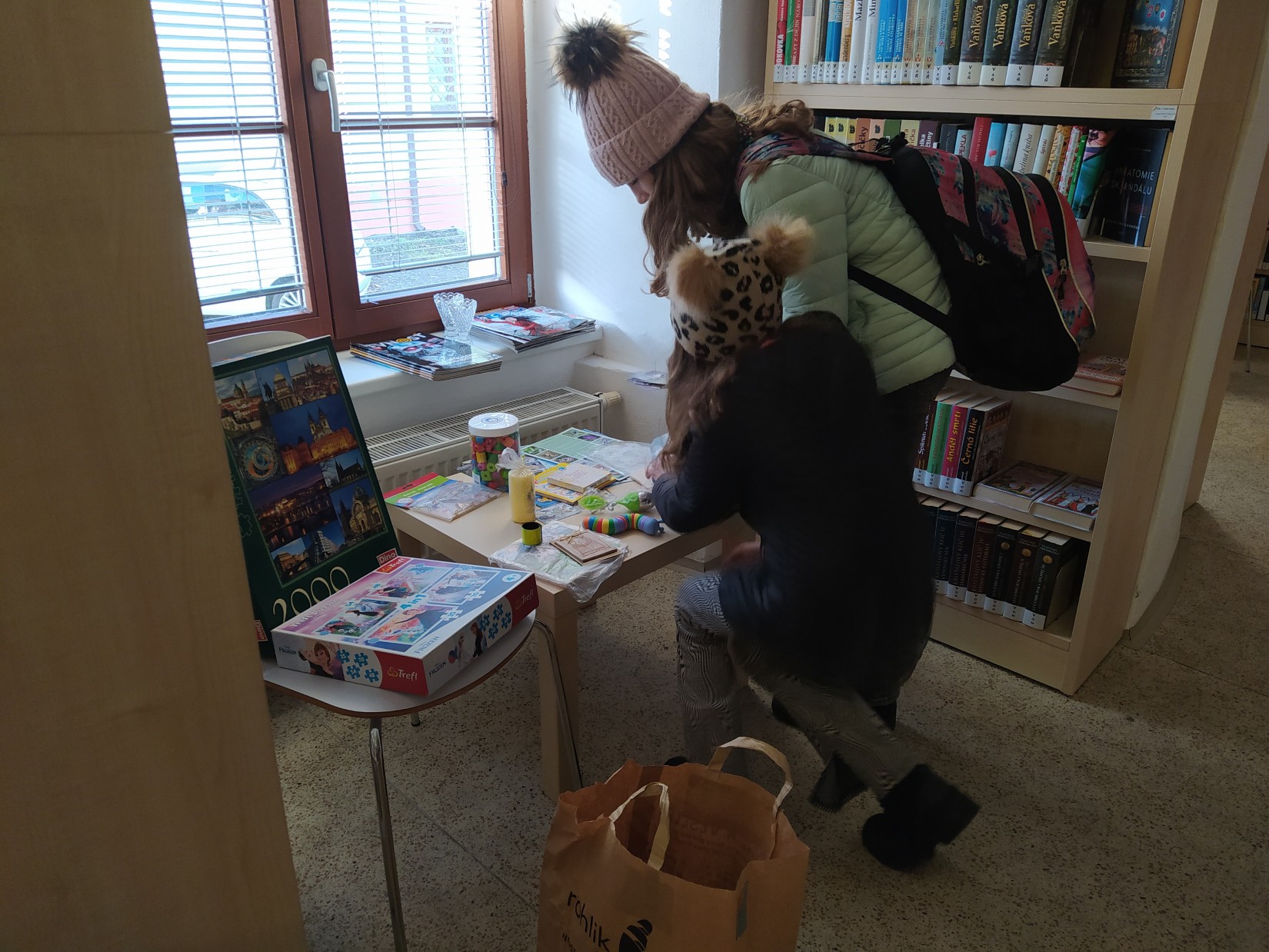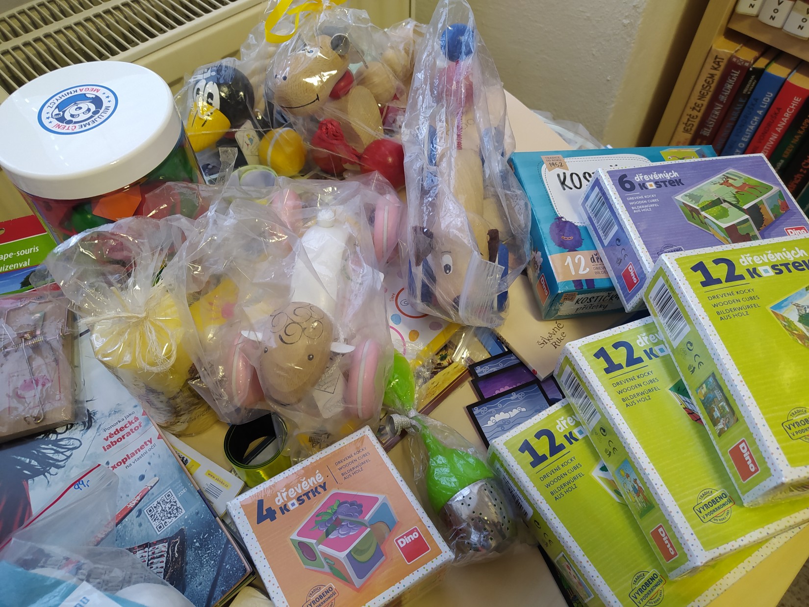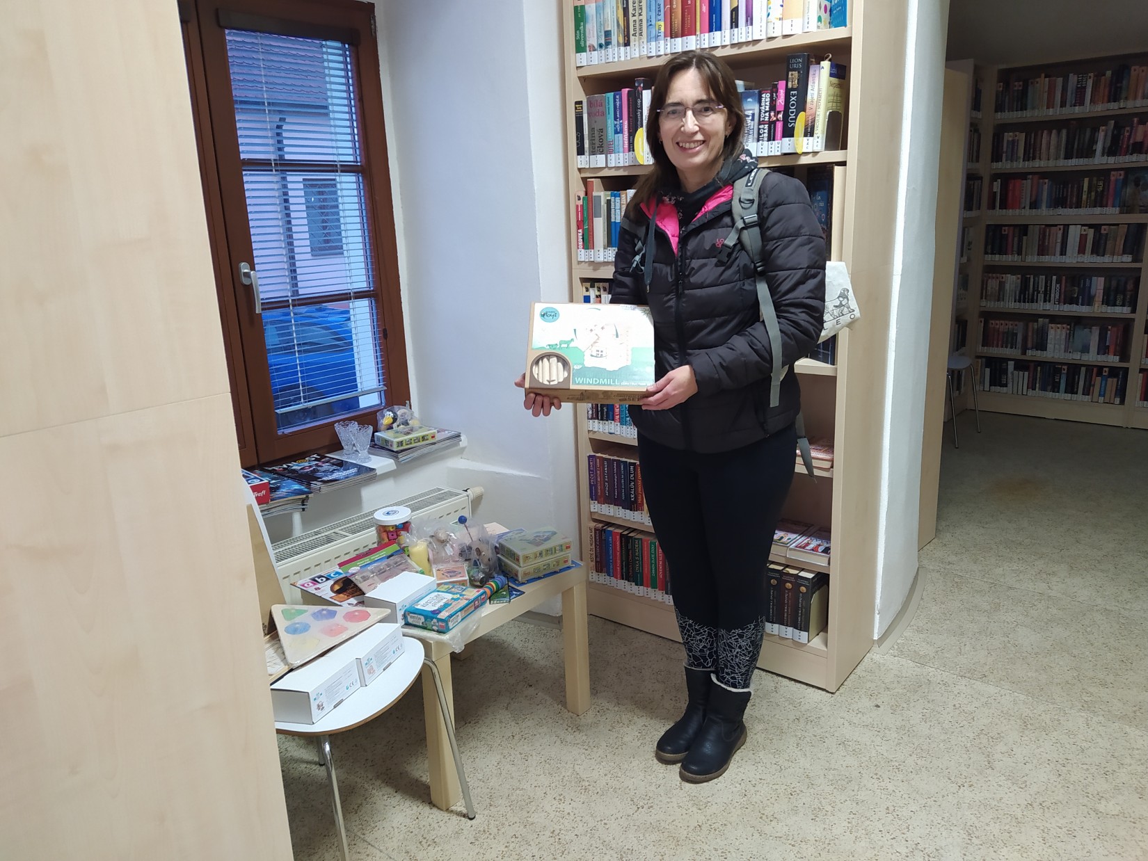 Krásný den plný krásných zážitků. V knihovně se opět rozdávaly dárky a pak najednou přijde naše čtenářka s óóóbrovskou taškou, a že nese další dárky, pro čtenáře. Paní přinesla krásné dřevěné hračky, ze kterých se hned vzápětí další návštěvníci zaradovali. Na fotkách jsem se pár momentů snažila zdokumentovat. Je tam i sympatická dárkyně, které mockrát děkuji, za její velký dar.